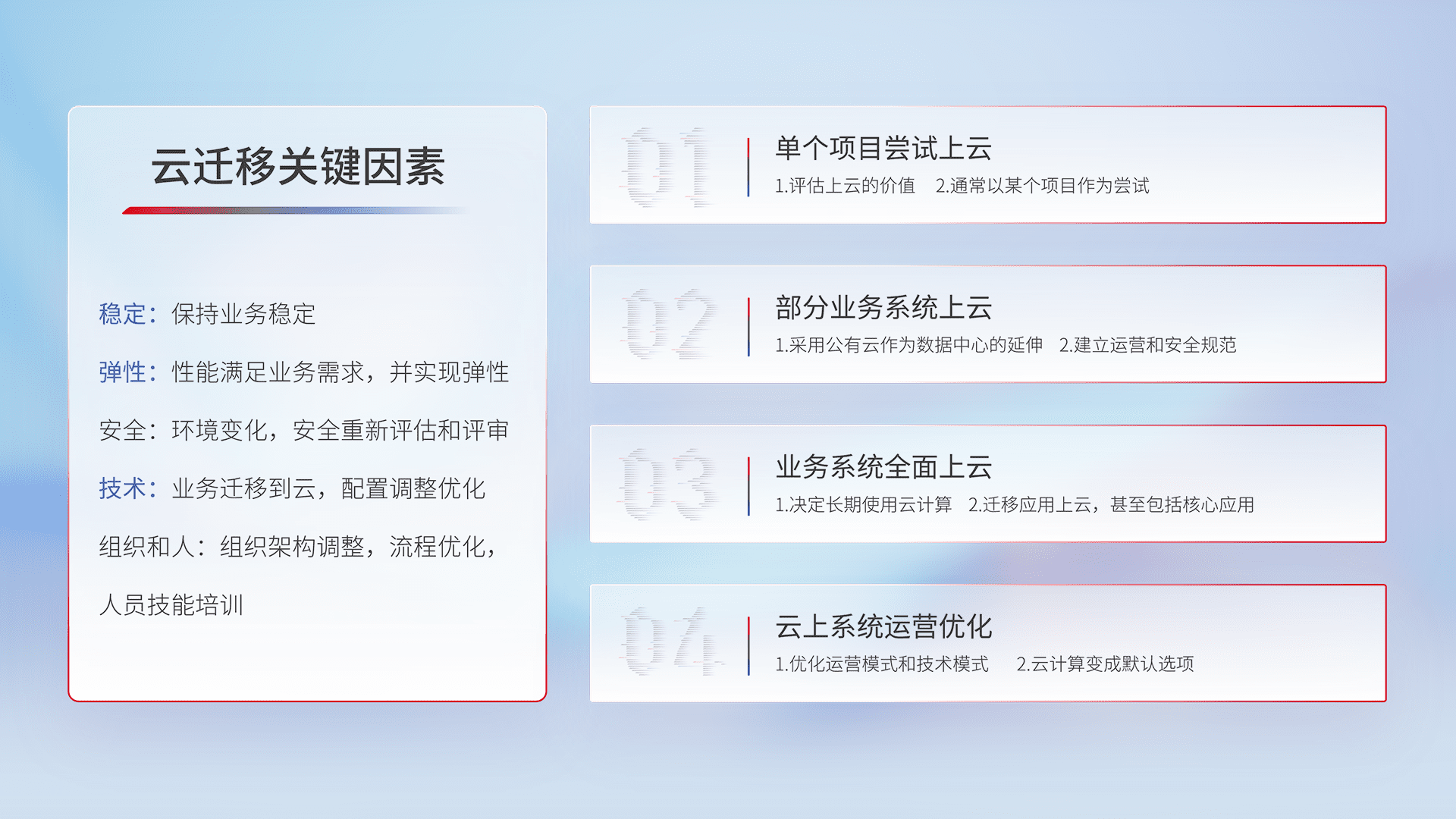 结合实际业务,,,从规划设计、、、云平台选型、、、、云原生改造、、数据迁移、、、集成交付,,,迁移全过程为客户识别最佳上云路径,,,,做好风险识别管理,,,设计网络架构、、身份权限、、、、安全审计合规、、操作审计、、日志审计、、、、监控告警策略、、多站点容灾设计等,,,对云上基础设施进行整体规划,,提升IT治理水平,,,以满足弹性、、、、高可用、、高性能的需求。。。