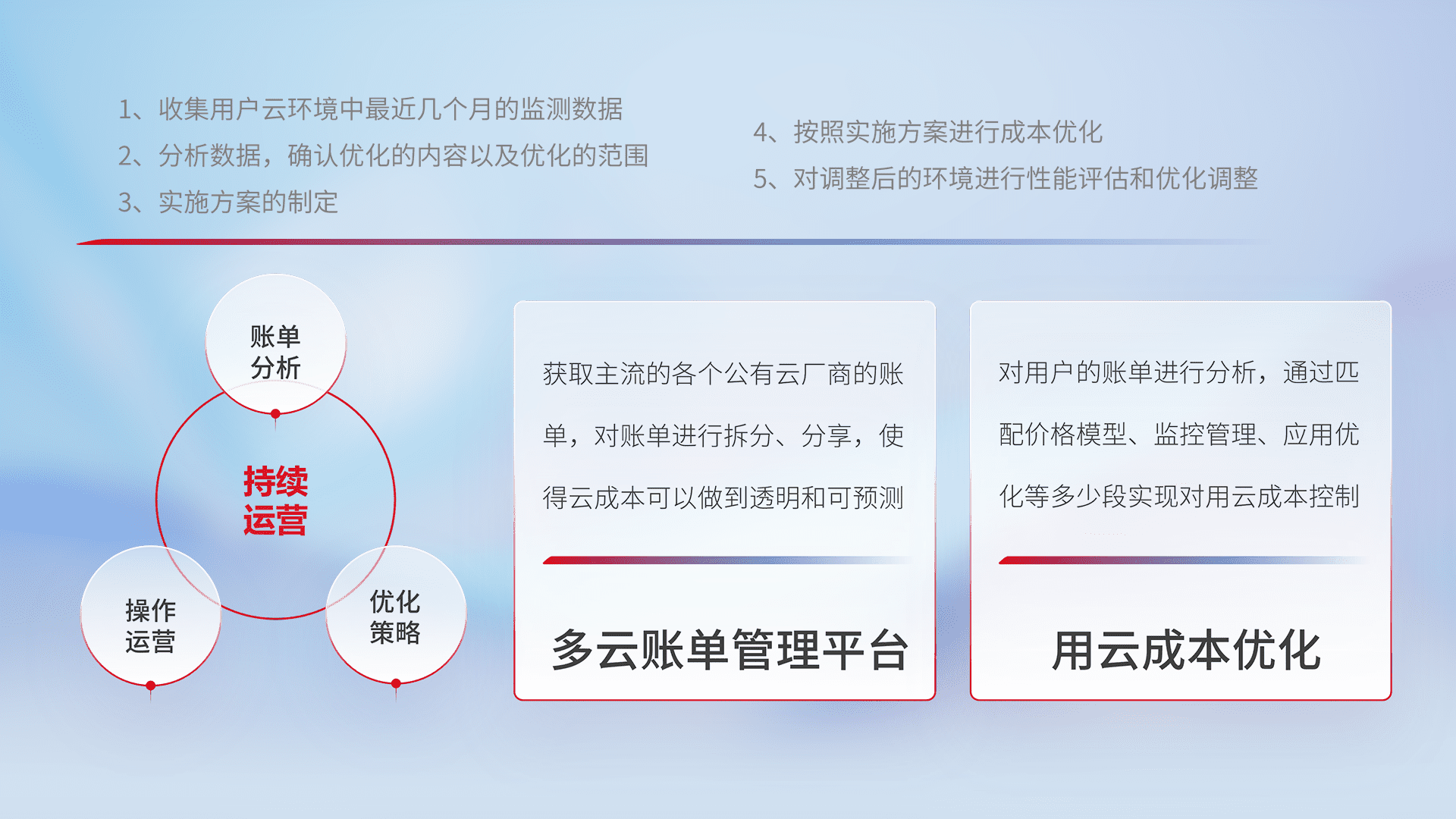 通过多云纳管,,,,以统一的资源数据模型把客户的云资源进行抽象和封装,,,,进而实现对多云资源的统一操作,,保障云资源管理的可靠性、、稳定性与可用性。。。量身定制化运维内容,,配置、、、、开发运维、、补丁管理、、、、备份、、监控、、认证和访问管理、、、、审计和日常巡检等,,,保障在用云过程中的可靠度,,,稳定度以及高可用率。。