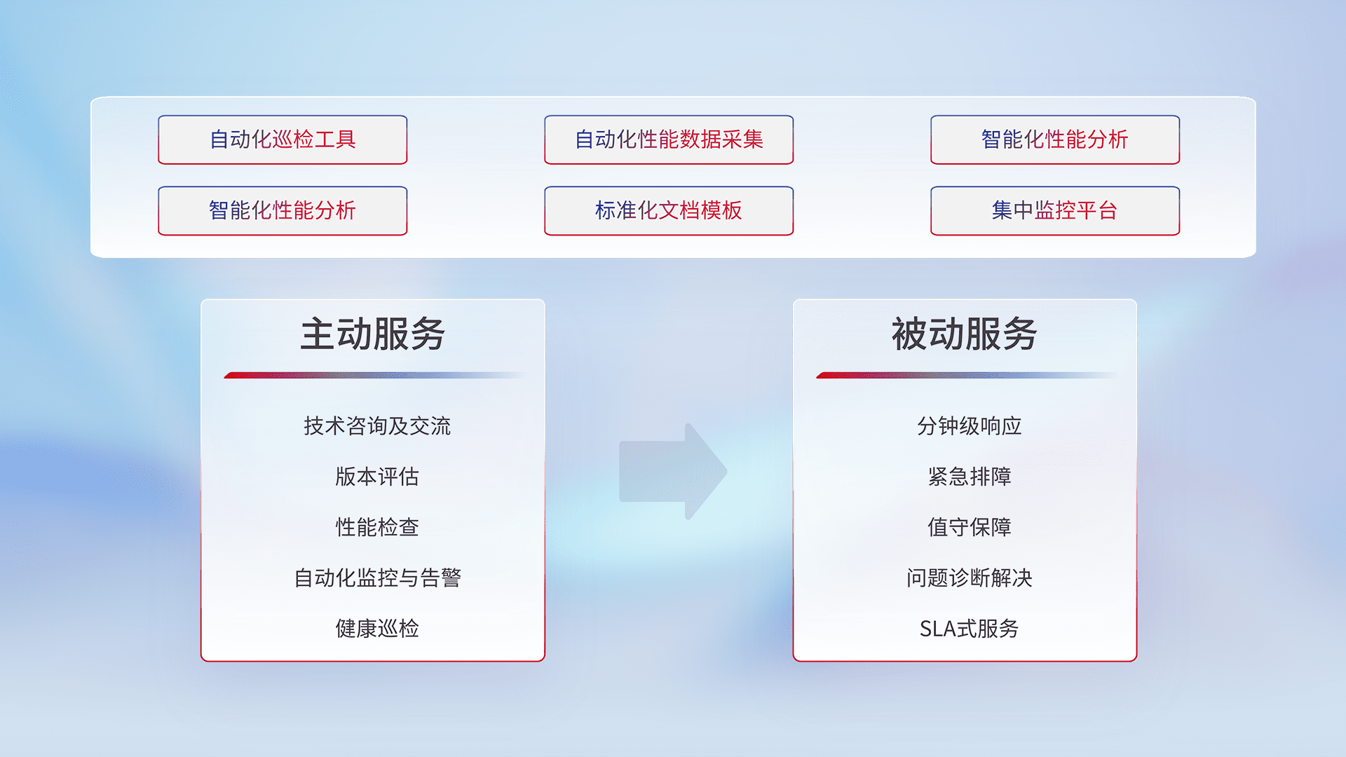 智能化工具和标准化文档,,保障服务质量,,,,提供主动服务(包含技术咨询、、、、版本评估、、、性能检查、、、、自动化监控与告警、、健康巡检)和被动服务包含(分钟级响应、、、紧急排障、、、值守保障、、、、问题诊断解决、、、SLA服务)。。。。